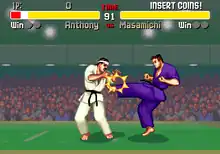 The gameplay has a 6-button layout, but with command inputs different compared to ones in most fighting games released at the time. There are three punches and kicks for a few directions (weak, medium and strong). There are seven fighting styles featured in the game and two playable characters per style, for a total of 14 playable fighters.