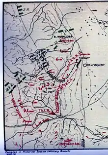 The Germans found themselves caught in numerous cross fires from the front, flank and rear from the mutually-supporting defensive positions, while the Ottoman forces deployed on their left and right flanks were unable to strongly support the German attack.[17][21][36] On the left of the main attack the Ottoman 32nd Regiment made a frontal attack on Mussallabeh and captured a post, which was retaken by the defenders shortly after.[38] Three attempts were made by the left of the attacking force on Mussallabeh, but were driven back each time with heavy loss by well placed machine-gun fire leaving about 200 dead. The whole position was completely restored and 380 German and about 200 Ottoman prisoners were sent back to headquarters.[39] On the right flank, Ottoman units from the Ottoman 58th Regiment climbed a cliff to attack View post but a sentry shot the leaders; one of whom must have been carrying incendiary bombs as he burst into flames. By the light of this human torch the remaining would-be attackers were shot, and as a result the remaining Ottoman soldiers at the bottom of the cliff did not make another attack.[40] Regardless, the attack by the Ottoman 163rd Regiment on Vaux post continued.[41]