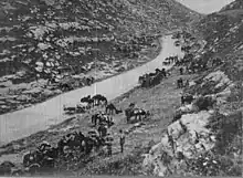 El Mussallabeh had been attacked on 11 April, between the first and second Transjordan raids.[8][9][10] The attack had been launched by a composite force of four Ottoman infantry battalions and several batteries.[11] Subsequently, defensive work was carried out.[12] From early May, when the withdrawal of the forces involved in the second Transjordan attack was complete, the occupation of the Jordan Valley by the Egyptian Expeditionary Force was unchallenged, except for the attacks on 14 July and shelling by long-range Ottoman and German artillery.[13][14]