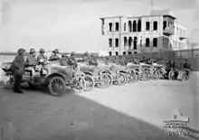 Nuri Bey's Sherifial Force was joined by a second Sherifial Force of 1,500 Hejaz Arab troops commanded by Sherif Nasir which Prince Feisal had ordered to advance from Homs to Aleppo.[15][24][25] Meanwhile, the 15th Imperial Service Cavalry Brigade caught up with the armoured cars at Zi'bre 13 miles (21 km) south west of Aleppo. They relieved the armoured cars on outpost duty during the evening of 25 October while Column "B" of the 5th Cavalry Division reached Seraikin about 30 miles (48 km) south of Aleppo.[15][26]