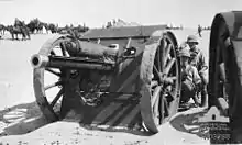 The New Zealand advance began at 04:00, at the same time the 3rd Brigade made towards a redoubt over two miles (3.2 km) to the south. It was not for another hour that the Composite Brigade set out, but they located a trench system from the well to Lake Bardawil.[10] The ANZAC Mounted Division advanced through Turkish artillery and machine gun fire, until it got so heavy that it threatened the safety of their horses. Dismounting they continued on foot. However, they were not advancing in one continuous line. There was a gap around 800 yards (730 m) between the New Zealanders and the depleted Composite Brigade and around one mile (1.6 km) between the 3rd Brigade and the New Zealanders.[11] By 05:00 that the New Zealand Brigade had reached a high point that overlooked the well and the Turkish position. An hour later the Turkish troops, left their trenches fixed bayonets and counter-attacked the New Zealand Brigade in two columns.[3][11] This first assault faltered in the face of the New Zealanders machine-gun and supporting artillery fire from the Somerset Battery, Royal Horse Artillery. The respite lasted for thirty minutes when the Turkish troops attacked the New Zealanders again. Then the Composite Brigade, which was still advancing, came under fire from artillery, anti-aircraft and machine-guns, was halted around 800 yards (730 m) from the Turkish lines. By 07:00 the Turkish had discovered the gap in the ANZAC Mounted Division line between the New Zealanders and the Composite Brigades and were trying to exploit it.[11] An hour later on the southern flank the 3rd Brigade advance was halted and they were ordered to change their direction of advance towards Ard, instead of trying to circle it. At the same time closing the gap between them and the New Zealanders.[8][12] The New Zealand Brigade advanced again, and at one stage it seemed like two of their regiments, may succeed in breaking into the Turkish position. But elsewhere in the north and south the brigades had been fought to a standstill. Turkish artillery fire intensified and at 10:30 Chavaul asked for air support to help locate their batteries. Part of the problem being they were a larger calibre than the British guns and were out-ranging them. At the same time he sent one of his reserve regiments the Warwickshire Yeomanry to support the Composite Brigade.[8]