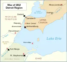 On August 5, 1812, Major Thomas Van Horne and the 200 U.S. soldiers were en route south to the River Raisin, where they were to pick up cattle and other needed supplies and escort them back to Fort Detroit for the use of Brigadier General William Hull. Hull was, at the time, in the Canadian village of Sandwich, now known as Windsor, Ontario, although he would abandon his position there and return to Detroit on August 8.[1]