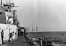 At 16:01 the Italian destroyers generated smoke and the battleships got under cover. There is some debate about this point today, the Allied position being that the battleships were leaving battle, the Italian that they were attempting to make a torpedo attack with their destroyers from within the smoke.[17]