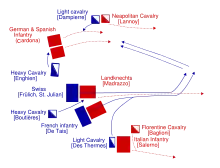 The French infantry—mostly Gascons—had meanwhile started down the slope towards Sanseverino.[30] Montluc, noting that the disorder of the Italians had forced them to a standstill, suggested that De Tais attack Madruzzo's advancing column of landsknechte instead; this advice was accepted, and the French formation turned left in an attempt to strike the landsknechte in the flank.[40] Madruzzo responded by splitting his column into two separate portions, one of which moved to intercept the French while the other continued up the slope towards the Swiss waiting at the crest.[41]
