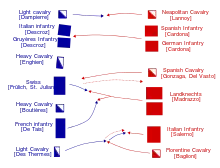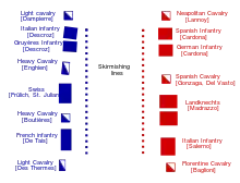 The initial dispositions of the opposing armies; the French troops are shown in blue and the Imperial troops in red.