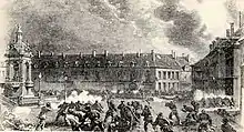 Obeying orders, General Wittich, commander of the German 22nd Division[10] advanced from Orléans to the northwest, and attacked Châteaudun on the Loire which was defended by Lipowski's irregular forces.[4] Wittich's forces had the overwhelming advantage in numbers,[1] and each French soldier fought 10 Prussians, while enduring heavy and fierce fire of the Prussian artillery.[7] At around 6 p.m., the French obstacle course Rue Galante (Rue de Civry) was isolated and had to be given up. The advance of the Prussian army could not be repelled. French snipers retreated into the center of town even though it was dark. The Prussians were determined to capture the market place at Châteaudun,[8] and they attacked in droves.[7] A terrible battle broke out in the night,[8] in which the two sides fought hand-to-hand.[7] The Prussians were forced to capture each house one by one.[10] Three times the French repelled the Prussians at Rues de Chartres (Rue Jean Moulin) and d'Orléans (Rue de la République), and dead bodies were piled up on the battlefield.[8] Finally, the German army claimed victory,[5] partly due to the strength of their artillery.[9] Faced with a hopeless situation,[8] Châteaudun was bombarded by the Germans and burned to ashes.[9] The French irregulars holding Châteaudun then conducted a retreat, leaving behind a number of prisoners in the hands of the German army.[1][10]