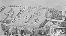 I was lying in my tent . . . down with fever. We were doing all we could to fortify the camp... Just before sunrise we were saluted by a six-pound shot which passed through the officer’s mess tent, knocking their kettles and cooking apparatus in all directions. Everyone, of course, went to his station in the ditch, and the Boers then kept up an incessant fire from four pieces of artillery and small arms, never ceasing for a moment during the whole day till sunset. During the whole day Margaret and Janet [Capt Lonsdale’s wife and daughter], were lying on the ground in the tent, close by me. James[lower-alpha 1] ... was lying in my other tent on the ground, with his legs on the legs of a table, when a six-pound shot cut off the table legs just above him, and the splinters struck him in the face. When the attack was over, the officers came to our tents, expecting to find us all dead. I said if they attacked us the next morning we should all have to go into the trench. Margaret then got up and put on a few things, and assisted me in putting on something. I had scarcely got on my trousers when we were again attacked. Margaret and the children ran immediately to the trench, and I was carried into it, and we all lay down or sat up. The fire continued all day, as on the day before. About the middle of the day the children were getting very hungry. Janet said there was a bone of beef in the tent, and she would go for it; but we did not wish her, as she might have been shot; but before I knew much about it she was back with the bone. We all slept in the trench this night. Next morning we were awakened by a shot from one of the great guns passing just over our heads. Shortly after a flag of truce came in, and Margaret and the children went on board the Mazeppa in such a hurry that they had not a change of clothes.