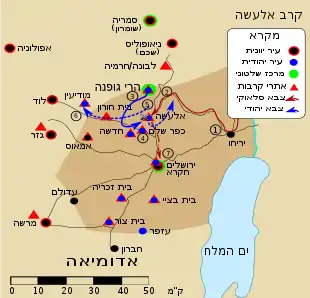 ![]() A rough reconstruction of the line of Bacchides' march (red line) in his second expedition | |||||||