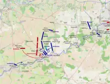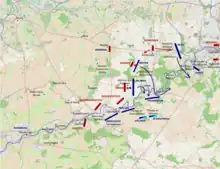 At this time Prince Coburg warned his wing commander that the main army was moving in the direction of Tournai and that Kaunitz must act strictly on the defensive.[14] On 18 May 1794, Coburg and his 74,000-strong army were defeated in the Battle of Tourcoing by the 82,000-man left wing of the Army of the North, led by Souham in the absence of Pichegru. This was followed on 22 May by the Battle of Tournay in which Coburg defeated Pichegru's attacks.[15] Kaunitz deployed an outpost line along the north bank of the Sambre with Prince Heinrich XV of Reuss-Plauen in charge of the left and Paul Davidovich directing the right. Aware of the large numerical superiority of the French, the Austrian wing commander issued orders to be carried out in case a retreat was necessary.[14]