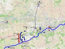 At dawn on 10 May 1794, the French force advanced toward the Sambre in seven columns, seizing crossings at Thuin and Lobbes that day. On the 11th, a column crossed at Aulne Abbey farther east and Marceau occupied Fontaine-l'Evêque. On the 12th the French captured Merbes-le-Château to the west. Kaunitz withdrew his corps into an entrenched position with its right flank at Grand-Reng, its center at Rouveroy and its left near Binche. On 13 May 1794 in the Battle of Grand-Reng the French attacked Kaunitz. Muller unsuccessfully assaulted Grand-Reng while Fromentin's attack against the center was stopped by Austrian cavalry. Kaunitz then launched a counterattack[8] which compelled the French to withdraw south of the Sambre with losses of 4,000 men and 12 guns.[9]