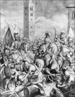 The Battle of Forlì in 1282 took place between an army recruited in France, sent by Pope Martin IV in an attempt to subdue Forlì and the Ghibellines. The Guelph army was defeated thanks to the strategic ability of Guido I da Montefeltro. The event was remembered by Dante in the Divine Comedy