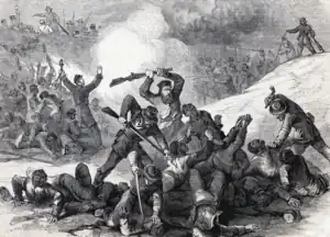 ![]() Caption in Frank Leslie's Illustrated Newspaper (New York), May 7, 1864, "The war in Tennessee: Confederate massacre of black Union troops after the surrender at Fort Pillow, April 12, 1864" | |||||||