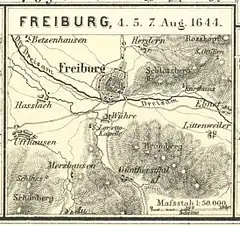 Turenne, who had withdrawn to Breisach, was ordered to relieve Freiburg, which he reached on 1 July with around 8,000 men. By this time, the Bavarians had established strong positions in the mountains at Schönberg and Lorettoberg, as well as a series of redoubts along the plain in front of the town.[7] When his initial assault was repulsed, Turenne broke off the attack and demanded reinforcements from Cardinal Mazarin.[14] On 2 August, 9,000 men arrived in Breisach from Flanders, led by Condé, although Freiburg itself had surrendered on 28 July.[lower-alpha 3] As he was senior to Turenne, Condé assumed overall command, and decided to attack the following day.[15]