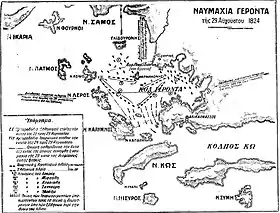 The Battle of Gerontas (Greek: Ναυμαχία του Γέροντα) was a naval battle fought close to the island of Leros in the southeast Aegean Sea. On 10 September [O.S. 29 August] 1824, a Greek fleet of 75 ships defeated an Ottoman armada of 100 ships[4] contributed to by Egypt, Tunisia and Tripoli.