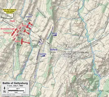 Confederate Maj. Gen. Henry Heth's division, from Lt. Gen. A.P. Hill's Third Corps, advanced towards Gettysburg. Heth deployed no cavalry and led, unconventionally, with the artillery battalion of Major William J. Pegram.[5] Two infantry brigades followed, commanded by Brig. Gens. James J. Archer and Joseph R. Davis, proceeding easterly in columns along the Chambersburg Pike. Three miles (4.8 km) west of town, about 7:30 a.m., Heth's two brigades met light resistance from cavalry vedettes and deployed into line. Eventually, they reached dismounted troopers from Col. William Gamble's cavalry brigade. The first shot of the battle was claimed to be fired by Lieutenant Marcellus E. Jones of the 8th Illinois Cavalry, fired at an unidentified man on a gray horse over a half-mile away; the act was merely symbolic.[6] Buford's 2,748 troopers would soon be faced with 7,600 Confederate infantrymen, deploying from columns into line of battle.[7]