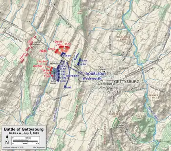 Gamble's men mounted determined resistance and delaying tactics from behind fence posts with rapid fire, mostly from their breech-loading carbines. While none of the troopers were armed with multi-shot repeating carbines, they were able to fire two or three times faster than a muzzle-loaded carbine or rifle with their breechloading carbines manufactured by Sharps, Burnside, and others.[8] (A small minority of historians have written that some troopers had Spencer repeating carbines or Spencer repeating rifles but most sources disagree.)[9][lower-alpha 2] The breech-loading design of the carbines and rifles meant that Union troops did not have to stand to reload and could do so safely behind cover. This was a great advantage over the Confederates, who still had to stand to reload, thus providing an easier target. But this was so far a relatively bloodless affair. By 10:20 a.m., the Confederates had reached Herr Ridge and had pushed the Federal cavalrymen east to McPherson Ridge, when the vanguard of the I Corps finally arrived, the division of Maj. Gen. James S. Wadsworth. The troops were led personally by Gen. Reynolds, who conferred briefly with Buford and hurried back to bring more men forward.[10]