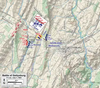 General Buford recognized the importance of the high ground directly to the south of Gettysburg. He knew that if the Confederates could gain control of the heights, Meade's army would have a hard time dislodging them.[lower-alpha 1] He decided to utilize three ridges west of Gettysburg: Herr Ridge, McPherson Ridge, and Seminary Ridge (proceeding west to east toward the town). These were appropriate terrain for a delaying action by his small division against superior Confederate infantry forces, meant to buy time awaiting the arrival of Union infantrymen who could occupy the strong defensive positions south of town, Cemetery Hill, Cemetery Ridge, and Culp's Hill.[3] Early that morning, Reynolds, who was commanding the Left Wing of the Army of the Potomac, ordered his corps to march to Buford's location, with the XI Corps (Maj. Gen. Oliver O. Howard) to follow closely behind.[4]