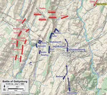 However, Rodes beat Schurz to Oak Hill, so the XI Corps division was forced to take up positions in the broad plain north of the town, below and to the east of Oak Hill.[29] They linked up with the I Corps reserve division of Brig. Gen. John C. Robinson, whose two brigades had been sent forward by Doubleday when he heard about Ewell's arrival.[30] Howard's defensive line was not a particularly strong one in the north.[31] He was soon outnumbered (his XI Corps, still suffering the effects of their defeat at the Battle of Chancellorsville, had only 8,700 effectives), and the terrain his men occupied in the north was poorly selected for defense. He held out some hope that reinforcements from Slocum's XII Corps would arrive up the Baltimore Pike in time to make a difference.[32]