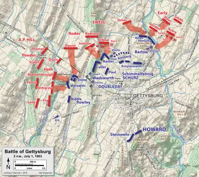 In the afternoon, there was fighting both west (Hill's Corps renewing their attacks on the I Corps) and north (Ewell's Corps attacking the I and XI Corps) of Gettysburg. Ewell, on Oak Hill with Rodes, saw Howard's troops deploying before him, and he interpreted this as the start of an attack and implicit permission to set aside Gen. Lee's order not to bring about a general engagement.[33]