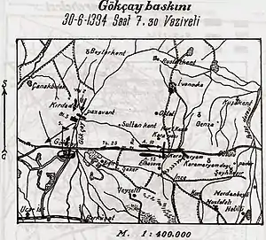 Red Army forces launched a night attack on the 5th Caucasus Infantry Division in Goychay from their left flank with the help of local Armenian and Russian villages.[34] The attack force consisted of about a thousand troops, two cannon and two machine guns. Bolshevik forces under the leadership of Emirov, an ethnic Armenian, launched an attack on the villages of Pazavand and Kyrdadut. The civilian population of Goychay fled to Ujar. There were no regular soldiers in the city. That night, a new volunteer cavalry division, under the leadership of General-Major Ahmad Hamdi Gara Agha Zadeh arrived at Ganja from Gazakh. They immediately marched to the city. The head of the General Staff informed the 25th Infantry Battalion of the attack and ordered them to help Goychay. The head also called for the commander of the Aghdash region, General Ali İhsan Sâbis, to help.[35] The Azerbaijani cavalry forces under Ahmad Hamdi's leadership tried to hold off the Bolshevik forces, but were fully defeated by 7:00 am.[11][13]