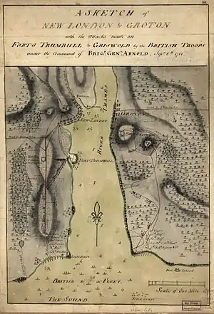 - ↑ A sketch of New London and Groton with the Attacks made on Forts Trumbull and Griswold by the British Troops. 1781.