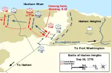 After scattering the Americans at Kip's Bay, Howe landed 9,000 more troops, but did not immediately cut off the American retreat from New York Town in the south of the island.[9] Washington had all of his troops in the city on their way to north along the west side of Manhattan to Harlem Heights by 4:00 pm and they all reached the fortifications on the Heights by nightfall.[10]