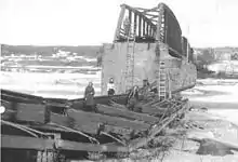 At 05:30 on 15 April, the Germans attacked the Norwegian positions defending the Hegra railway station, Hegra road bridge and Mælen bridge, supported by artillery fire. Having been partly caught by surprise, the Norwegian forces at the Hegra road bridge and the railway station made a fighting retreat to the fortress over a two- to three-hour period. Early on in the fighting, the Norwegians demolished the Hegra road bridge,[28] forcing the German infantry to cross the precarious ice of the frozen Stjørdal River under fire.[29] At Mælen bridge, the guards withdrew to the south.[30] Four Norwegian soldiers fell in and around Hegra, while one was killed at Mælen bridge.[31] In addition to those killed, eight Norwegian soldiers were taken prisoner during the initial German attack.[32]