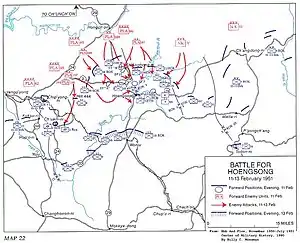 The Battle of Hoengsong, also known as Hoengsong Counteroffensive (Chinese: 橫城反擊戰) was a battle during the Korean War that took place between February 11–15, 1951. It was part of the Chinese People's Volunteer Army (PVA) Fourth Phase Offensive and was fought between the PVA and United Nations forces. After being pushed back northward by the UN's Operation Thunderbolt counteroffensive, the PVA was victorious in this battle, inflicting heavy casualties on the UN forces in the two days of fighting and temporarily regaining the initiative.