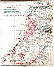 All available lorries and camels were organised in convoys moving north from the railhead along the Gaza to Junction Station road from Deir el Belah to El Mejdel and then on to Julis, where the 26 and 27 Depot Unit of Supply (DUS) set up advanced supply dumps to serve the Australian Mounted Division and the Anzac Mounted Division.[22] From these dumps the Transport Sections of 5 Company (New Zealand Army Service Corps) and the 32nd, 33rd, and 34th Companies (Australian Army Service Corps) served the Anzac Mounted Division, and the 35th, 36th, and 37th Companies served the Australian Mounted Division. These companies of horse- and mule-drawn wagons could operate to serve their brigades during brigade operations and when required could form into divisional trains during divisional operations. A forward lorry-head was established at Ramleh, where the loads were dumped and the Transport Companies distributed the supplies to the forward units. Members of the Egyptian Labour Corps (as second drivers) worked alongside the Australian Army Service Corps transporting, loading, and unloading the General Service and Limber wagons of supplies ordered by the brigades. The huge endeavour was administered by the supply sections in a similar fashion to the divisional ammunition columns which also worked to supply ammunition to the fighting units in a similarly continuous operation.[23][24]