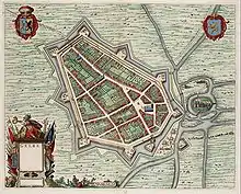 The defeat at Kallo reduced the size of the States' army under Frederick Henry to 119 foot and 54 horse companies, plus the 27 under Henry of Nassau-Siegen intended to relieve the forces which had landed at Waasland, which were at Lillo.[37] To replace the losses, the Prince of Orange ordered 30 infantry companies from various garrisons to be gathered at Gorkum.[38] In the south, the French Army had left the siege of Saint-Omer on 12 July, tough it remained in the area and, during August and September, besieged and took the minor towns of Renty and Le Catelet.[39] While the Dutch remained passive, the Spanish launched a surprise attack over the State's cavalry camp near Wouw on 27 July, but it was rebuffed.[37] Since the campaign season was not over, Frederick Henry considered to undertake an operation against the Spanish in the province of Upper Guelders, namely over Gennep or Geldern, as a mean of threatening Venlo and Roermond.[40] The States' Army departed Bergen op Zoom on 11 August and moved to 's-Hertogenbosch, where it arrived two days later. On 14 July the prince received into the city Marie de' Medici, the exiled queen mother of France. He did not accompany her in her visit to Amsterdam, but remained at 's-Hertogenbosch to reorganize the army. On 14 August, the States' troops took the way to Grave. In the meantime, Count Henry Casimir advanced over Geldern from Rheinberg ahead 50 foot and 9 cavalry companies and invested the town. Having crossed the Meuse at Grave on 17 August, Frederick Henry and his army joined the siege on the night of 21 to 22 August.[41]