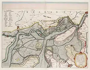 The Prince of Orange departed The Hague on 25 May and, on 1 June, the same day that the French Army laid siege to Saint-Omer, in Artois, he took command of the field army of the Dutch States, which had been assembled at a camp in the village of Lithoijen, in Brabant. A 3,000-men detachment under Count Henry Casimir of Nassau-Dietz was sent to Nijmegen to guard the southern border of the Republic, while Frederick Henry led the bulk of the army to Dordrecht, where it embarked aboard a fleet of 30 warships that convoyed it with its artillery, horses and baggage to Bergen op Zoom.[19] Frederick Henry had planned at first to besiege Hulst, but, pressed by a deputation of the States General, he finally agreed to move upon Antwerp. To fully invest the city and prevent it from being relieved from Hulst and Ghent, the prince dispatched a force of 7,000 infantry and 300 cavalry under Count William of Nassau-Siegen aboard 53 large boats and many smaller ones —taken in 1631 from the Spanish at the Battle of the Slaak— to land at the Waasland, west of Antwerp.[20][21] They embarked at Dordrecht a day before that the main army did it, though both forces reunited briefly at Bergen op Zoom before the landing operation was undertaken.[22]