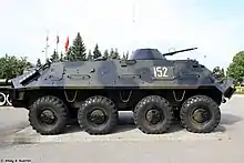 On 26 January Museveni went to Republic House, moving his command post to its canteen. He was greeted by Saleh, who briefed him on the status of the battle. The NRA's 1st Battalion was subsequently ordered to secure the city centre.[30] Along Parliament Avenue an NRA BTR-60 armoured personnel carrier (APC) was struck by a UNLA rocket-propelled grenade (RPG). The APC attempted to reverse to evade further fire but collided with a lorry which was hauling a 37 mm anti-aircraft gun. UNLA troops subsequently set both vehicles ablaze, and Radio Uganda—which had been broadcasting UNLA propaganda throughout the battle—declared that an NRA tank had been destroyed. Soldiers of the 1st Battalion and 3rd Battalion led by Mugisha and Patrick Lumumba employed RPGs to eliminate UNLA anti-armour defences around Radio Uganda.[31] By 15:00 the NRA had secured the Radio Uganda station,[32] killing a UNLA officer and capturing three soldiers.[33] Meanwhile, the 11th Battalion under Chefe Ali[22] captured Nakulabye, Makerere, and Kamwokya.[32] The unit then rushed the UNLA position at Summit View, forcing the troops manning the artillery to surrender[22] and forcing others—including their commanding officer, Lieutenant Colonel Eric Odwar—to retreat.[32] Telecommunications running out of the country were severed.[34] By the afternoon, UNLA troops still held out at the Nile Mansions, and the Parliament building.[35]