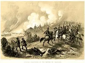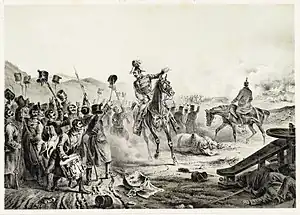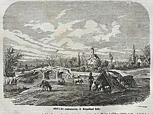 Dembiński, therefore, sent the infantry of the Driquet Brigade on the attack.[21] From the north, a battalion of the 16th Zanini Infantry Regiment, and along the highway the 44th and 47th Home Army Battalions advanced.[18] The Zaninis, led by Major Móric Psotta and Major Ferdinand Molnár and chaplain Cézár Mednyánszky, dressed in his priestly attire and carrying a crucifix, despite the enemy's canister fire,[15] advanced as far as the stone bridge over the Tarna.[22] There was a desperate struggle for possession of each building.[15] Máriássy personally led the attack of the 44th and 47th Honvéd battalions against the tavern on the eastern edge of the village, which was occupied by the K.u.K. troops.[22] and managed to occupy some houses and the tavern building[18] which was then secured by the 44th Battalion.[22] The battle was finally decided by the arrival of the Austrian reserves brought by General Wyss[15] which forced the Honvéds to retreat.[18] The Italian soldiers of the Zanini battalion who were fighting around the church in the northern part of the village became trapped: in the heavy fighting, they were surrounded by soldiers of the 23rd Schönhals Infantry Regiment.[18] The Zanini battalion, caught between two fires, found itself in a hopeless situation, with only a few of its men making it back to their Hungarian positions in a stampede, while their commander and most of the battalion eventually surrendered.[18] Dembiński subsequently described the Italians' deed as cowardly, claiming that they had laid down their weapons without firing a shot. However, even Austrian sources refuted this.[18] The attack of the Zanini battalion and their subsequent flight is described in the memory of the camp chaplain Cézár Mednyánszky, who led them: I got off the horse, said a few words to the soldiers, and then we started to advance. We were greeted by cartridge fire, but the Italians were braver than I thought. They broke into the village (and put up our flag [on a building]). But as soon as the Imperials came against us, they were frightened and scattered. I followed the example of Commander (Psotta) and I also ran to the place from which I had started. No sooner had I started to run, than an Imperial soldier rushed towards me and grabbed my left arm. I knew that as an Austrian prisoner, I would find no mercy. I struck him on the head with my massive silver cross and broke free. I ran to the gate of one of the houses and [this is how I] escaped. Bullets whistled all around me, but I reached our troops unharmed. Only my clerical robe was torn and my cross slightly bent.[3]