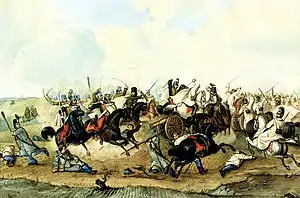 In the first hours of the battle, the Wyss brigade of the Csorich division and the Dietrich brigade of the Schwarzenberg division, coming from two different directions, forgot to occupy the Kompolt forest which lay between them.[7][9] Máriássy realized this and tried to break into the gap in the front line with 4 infantry, 5 cavalry and 2 batteries,[9] and thus tried to disrupt the Austrian deployment.[7] Under the cover of the Kompolt Forest, 4 companies of the Imperial Hussars, sent by Máriássy, had already reached the second line of the Austrian battle line when they were spotted.[7] General Wyss gave orders to Major Baron Baselli to attack the advancing enemy in the face with his squadron of Uhlans, while he, supported by the effective fire of 1 1/2 batteries, attacked his flank with 3 platoons of Chevau-légers under the command of Colonel William Albert, 1st Prince of Montenuovo.[9] Baselli's uhlans managed to disperse not only the leading squadron of the Alexander Hussars regiment, but also one of the infantry companies, which tried to defend themselves by forming an infantry square. In response, Máriássy himself took the lead of the now reinforced Alexander Hussars and drove back the uhlan troops.[9] The cavalrymen were fighting mixed up, so the Austrian artillery was unable to intervene.[7] Just when it seemed that success was finally in favour of the Hungarians, a cavalry detachment of Schwarzenberg's column appeared on one side, and on the other Colonel Montenuovo's chevau-légers, whose determined charge forced the hussars, which were fighting already without much order because of the preemptive attack of the Austrian uhlans, to retreat.[9] In addition, the unit led by General Wyss engaged in a heavy artillery duel with the Hungarian troops. The initial Hungarian superiority in the fight was countered by the Imperials' deployment of batteries from the artillery reserve, which resulted in 5 batteries pouring fire on the Hungarian positions.[7] In this way, they managed to neutralize the batteries on Máriássy's left flank, which also disturbed the other troops of the latter. This was compounded by the fact that a battalion of Schwarzenberg's column, engaged in an otherwise still undecided firefight, was also ordered to attack the Kompolt Forest under the lead of Major Regelsberg.[9] In the end, the division led by Máriássy retreated, first to the high ground in front of Kompolt, then to a position in front of Kápolna, which was still on the west bank of the Tarna.[14] So the Hungarians retreated, but then the Imperial Hussars led by Máriássy stopped the pursuing K.u.K. cavalry.[14]
