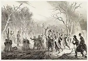 Among the English versions, Julian Kune/Kuné Gyula (1831-1914), a former Hungarian Honvéd and a fighter in the American Civil War, quotes an excerpt from the prayer text in his book Reminiscences of an Octogenarian Hungarian Exile, published in Chicago in 1911, entitled Kossuth's Prayer after the Battle of Kápolna.[37] In describing the Battle of Kápolna, the author compares many of its details to the Gettysburg Address which followed the Battle of Gettysburg (1863); showing that Kossuth, like Abraham Lincoln, consecrated the battlefield after the bloodshed with an unforgettable prayer.[37] The popularity of the prayer is indicated by the fact that woodcuts depicting Kossuth praying over the heroes at Kápolna were already being produced abroad in 1849.[32]