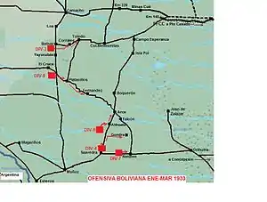 The Battle of Kilometer 7 was a series of clashes during the Chaco War between Bolivian and Paraguayan forces from 7 November 1932 to February 1933, and ended with a Paraguayan retreat to the northeast towards Gondra, later to be the site of the Battle of Campo Jordán. The Paraguayan initiative, which had belonged to the Paraguayans since the beginning of the siege of Boquerón passed to the Bolivian army until the Second Battle of Nanawa in July.