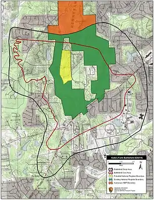 Much of the battlefield landscape has been altered and fragmented. Some essential features remain, however, including the Kolb farm house and family cemetery, Ward Creek, and the heights used by the Federal XX and XXIII Corps in their repulse of the Confederate assault. These resources are protected within the Kennesaw Mountain National Battlefield Park. Residential subdivisions have hemmed in the park land and overwhelmed the battlefield landscape beyond the park boundary, including the heights from which the Confederates began their assault.[1]