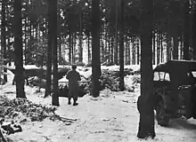 The platoon consisted of two nine-man reconnaissance squads and a seven-man headquarters section, which was attached to the 394th Regiment's S2 section.[9][10] As the platoon was not intended nor trained for combat, they were told to avoid direct engagement with the Germans. Nonetheless, they took part in several missions behind enemy lines, even as far as Losheim, 2 miles (3.2 km) behind the front line, to capture enemy soldiers for intelligence. Bouck and several of his men were among the first soldiers in their regiment to be recognized with the Combat Infantry Badge.[4][9] Most often their patrols consisted of creeping through snow-clogged defiles obscured by fog in an attempt to fix enemy positions.[3]