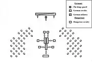 During the whole battle of Augsburg, the Hungarians waited for this moment, hiding their reserve troops in woods[28] that allowed huge numbers of soldiers to be concealed. The retreating main Hungarian army lured the attacking German cavalry to the places in which their reserve troops were hidden, and they continued to retreat until the whole pursuing German cavalry crossed the narrow field which separated two woods in which the Hungarian reserves were hidden, when suddenly without observing them, these hidden Hungarian reserves came out from their hiding places and attacked the Germans with loud screaming in order to frighten and demoralize them before the final clash.[29]