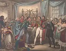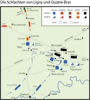 Only very late on the night of 15 June was Wellington certain that the Charleroi attack was the main French thrust, and he duly ordered his army to deploy near Nivelles and Quatre Bras.[9] Early on the morning of 16 June, at the Duchess of Richmond's ball, on receiving a dispatch from the Prince of Orange, he was shocked by the speed of Napoleon's advance, and hastily sent his army in the direction of Quatre Bras, where the Prince of Orange, with the brigade of Prince Bernhard of Saxe-Weimar, was holding a tenuous position against the French left commanded by Marshal Ney.[10] Ney's orders were to secure the crossroads of Quatre Bras so that if necessary he could later swing east and reinforce Napoleon.