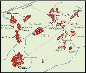 Blücher's troops consisted of the I Prussian Corps under Zieten, the II Corps under Pirch I[lower-alpha 4] and the III Corps under Thielmann. The I Corps was located in the foremost row and had support from the II Corps standing behind it – the task, the defence of the villages of Ligny, Brye, and Saint-Amand, while the III Corps formed the left wing and the routes of withdrawal while defending Gembloux and Namur. Blücher and Wellington had to avoid above all being separated. Still in the morning of the battle Wellington rode to a meeting with Blücher at the windmill of Brye (or Bussy) and promised Blücher the support of at least one Anglo-allied corps.[22] After the break for discussion with Blücher, Wellington left for Quatre Bras.