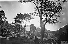 That the Germans did not suffer more casualties among their rearguard was thanks to the false reports of captured German askaris, who massively exaggerated the Schutztruppe's remaining strength when being questioned by 1/2nd KAR. Thus discouraged, the latter stopped its pursuit of the Germans, regrouped, and only resumed to cautiously advance at 16:00. The British forces coming from the east and west finally met around 17:00, by which all German units had managed to successfully escape northwards.[50] Due to the difficult terrain, however, the communications between the retreating Schutztruppe forces had "become hopelessly muddled" and order had also largely broken down: The western vanguard units, attempting to climb the steep northern granite hills, had become lost, while the situation among the main body was also chaotic. Only late into the night was Lettow-Vorbeck, who was still with Abt Müller and Abt Göring, able to reestablish contact and eventually reunite with the main body under Wahle.[52][53] One German detachment under Hptm. Köhl even became so completely lost that it was only able to reunite with the rest of the Schutztruppe after several days.[54][30]