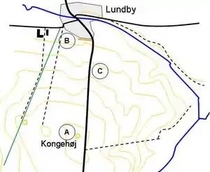 The scouts had been seen by the Prussians who had gone in cover with about 70 out of 124 men behind an earth dike in Lundby's south edge. From the burial mound Kongehøj about 500 metres south of the town, a long flat hill slopes down to the town. Beck ordered the company commander, Captain P.C. Hammerich, to carry out a strong determined bayonet charge from Kongehøj.