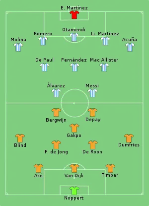 The first half of the game was relatively balanced, with both sides never having a clear-cut chance for the opening half-hour of the game. Both teams had dominant spells with Argentina coming close to creating a chance several times but being stopped by a disciplined Dutch defense.[9] Walter Samuel, the Albiceleste assistant manager, was cautioned at around the half-hour mark. Argentina forward and captain Lionel Messi then cut through the Dutch defense with a precise pass to assist Nahuel Molina for the first goal of the night.[10]