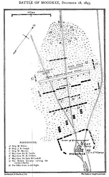 The Battle of Mudki was fought on 18 December 1845, between the forces of the East India Company and part of the Sikh Khalsa Army, the army of the Sikh Empire of the Punjab.[3] The British army won an untidy encounter battle, sustaining heavy casualties.[1]