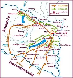 Jelačić began his withdrawal as early as 1 October, violating the armistice treaty's clause forbidding any military operations during the 72 hours of the ceasefire.[33] The Croatian army reached Mór on October 1 and Kisbér on October 2, from where he tried to take Komárom, the most powerful fortress of the country at that time, and finally appealed to the commander of the castle, Lieutenant-Colonel Majthényi, who had replaced the pro-Habsburg Lieutenant-General Mertz, to open the gates of the fortress, otherwise, he would destroy it together with the city. But Majthényi's denied this, so Jelačić continued his retreat to Győr, and on the 5th he arrived at Magyaróvár, then on the 7th of October he crossed the Hungarian-Austrian border, concluding in this way his unsuccessful campaign against Hungary.[33]
