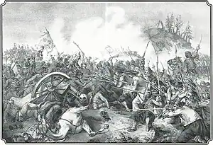 The right wing made an unsuccessful attack on the Serbian left wing which was defending the vineyards,[6] while the artillery shelled the town for three hours, setting several houses on fire.[14] The artillery had already fired two-thirds of its ammunition when Major Leiningen-Westerburg warned Ernő Kiss: either the troops must charge or retreat, because the soldiers would not stand the fire of the Serbian infantry and artillery in the open field for long.[15] The army was also impatient, some soldiers of the 9th (Red Hatted) Battalion were already pointing their guns at Kiss.[16] As usual, Kiss was perplexed, as he felt that the Hungarian artillery was not yet sufficiently prepared for the attack,[14] so he ordered the retreat but in such erratically that part of the army - including the 3rd (White Feathered) Battalion of the Honvéd Army, which was advancing - only learned of the order when they saw the other units retreat.[16] The cavalry and artillery turned at once, and in the greatest disorder, they rushed to the same bridge over which they had crossed the entrenchment, creating chaos there.[17] Fortunately, the other two bridges had been completed by then, and the army could use them.[17] The Serbs, especially Knićanin's Servians, pursued the retreating troops vigorously along the Franzfeld road, but without any serious success.[16] During the retreat, the Serbs attempted several times to outflank the retreating Hungarian troops.[16]