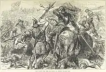 On the other flank, Somerset threw in his cavalry to delay the Scots' advance. The English cavalry was at a disadvantage, as they had left their horses' body armour at the camp. The Scottish pikemen drove them off, inflicting heavy casualties. Lord Grey himself was wounded by a pike thrust through his throat and into his mouth.[24] At one point, Scottish pikemen surrounded Sir Andrew Flammack, the bearer of the King's Standard. He was rescued by Sir Ralph Coppinger, and managed to hold onto the standard, despite its staff breaking.[8]