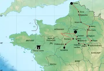 Bertrand du Guesclin was appointed constable of France on 2 October, in direct response to Knolles's campaign.[46] Charles considered that Guesclin had the necessary skills in leading small forces and in irregular warfare to implement the Fabian approach he had decided on.[48] On 24 October, Guesclin sealed a "pact of brotherhood-in-arms" with Olivier de Clisson, an experienced Breton commander, and by 6 November Guesclin was in Caen raising an army.[49] Guesclin concentrated his forces at Caen during November, and was joined there by reinforcements under the Marshals Mouton de Blainville and Arnoul d'Audrehem as well as a Breton contingent under de Clisson. Guesclin thus concentrated about 4,000 men.[50]