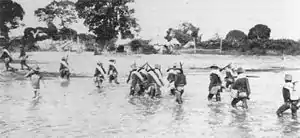 Shields, seeing that he was almost completely surrounded, ordered a withdrawal, which soon turned into a full-blown retreat, as Abad's much larger force poured over the ridge after Shields and his men. The Filipino soldiers harassed Shields for nearly 4 miles (6 km) before cornering them in a small rice field; their escape to Santa Cruz was cut off by the large force of Filipino bolomen. Abad's men again opened fire, forcing the Americans to take cover behind some paddy dikes. Shields, wounded and recognizing the futility of the situation, raised the white flag in order to surrender.[1]: 278